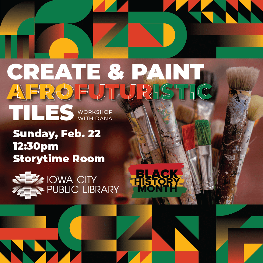 Kids are invited to celebrate Black History Month with Dana, this year's artist of Iowa City's Black History Month poster celebrating Afrofuturism, to create and paint titles. This one hour...